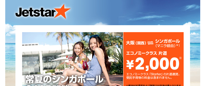 ジェットスターが13時間限定セール中 関西ーシンガポールが往復4,000円