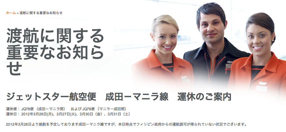 ジェットスター航空は、3月26日に新規開設を行う予定だった、東京/成田〜マニラ〜ダーヴィン線のうち東京/成田〜マニラ線で、フィリピン政府からの運航認可が下りないため、3月末までの全便を欠航する。