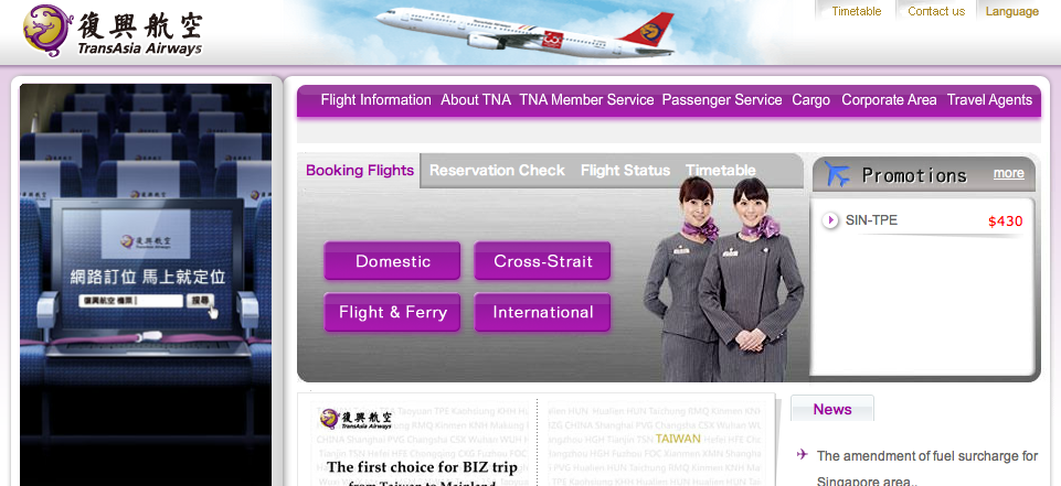 復興航空は、中華航空(チャイナエアライン)、エバー航空と並ぶ、台湾の三大航空会社のひとつ。