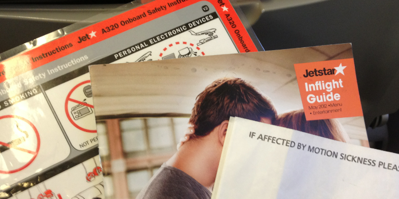 座席ポケットには、安全のしおり、インフライトガイドとゲロ袋の3つのみがありました。