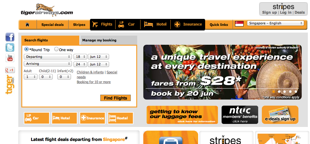 シンガポールのLCC、タイガーエアウェイズは、全路線で2012年6月20日まで、セールを実施している。
