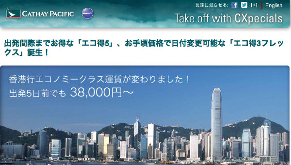 「エコ得5」は、残席に応じて金額が変動する航空券で、出発の5日前まで予約が可能で、成田〜香港往復は38,000円から。