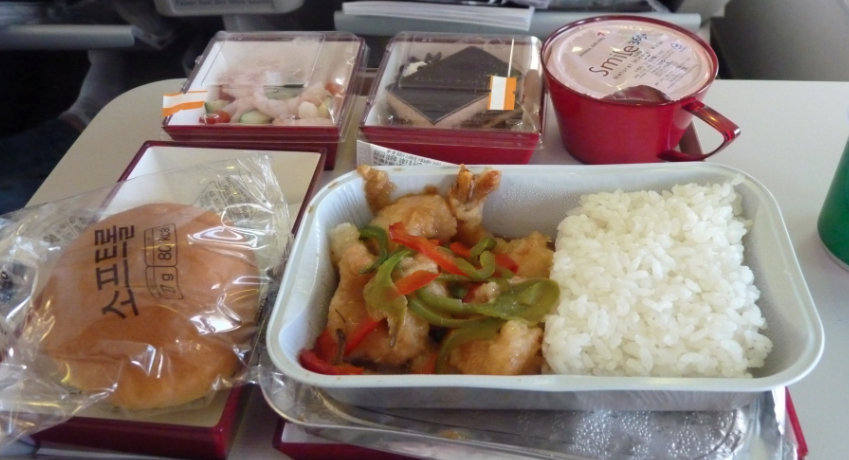 機内食は、炒め物とご飯でした。朝だとオムレツなどを提供する便が多いですが、ちょっとそちらを期待しているとヘビーかもしれません。