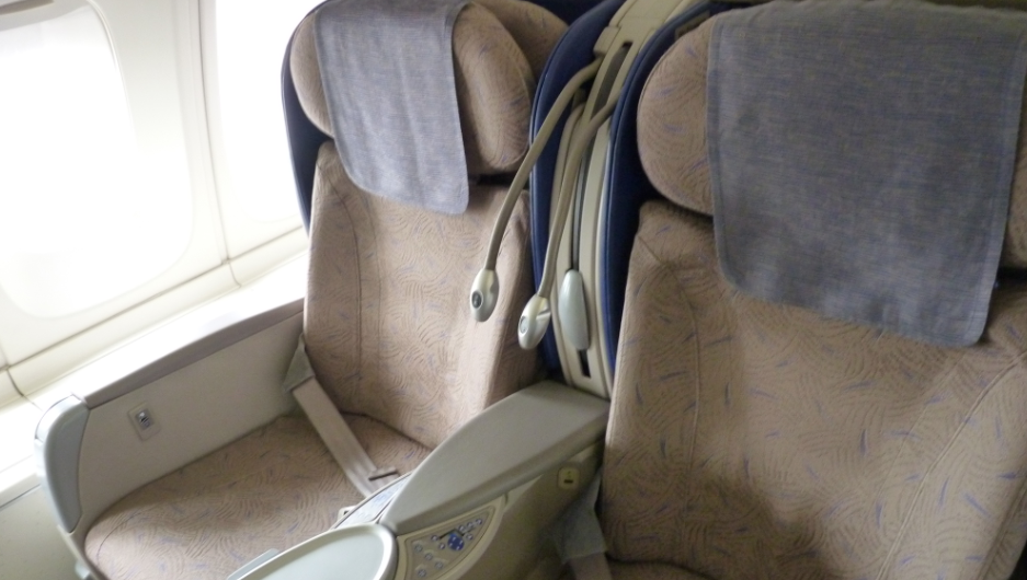 座席はビジネスクラスのシート。シート配列は、アッパーデッキは「2−2」となる。頭上の収納スペースのほか、窓側にもあるので、小物を入れるには便利となる。