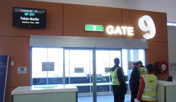ゴールドコースト空港の9番ゲートは、チェックインカウンターを抜けて、飲食店などのエリアに出た後右手に向かって、さらにもう一度セキュリティチェック⇒出国審査を行う必要があるので、チェックイン直後のセキュリティチェックを抜けたからとゆっくりしていると、慌てる事になりかねないので注意。(実際、慌てる事になった)