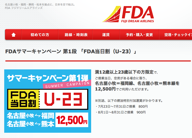 フジドリームエアラインズ(FDA)は、名古屋小牧〜福岡・熊本線の搭乗当日に空席がある場合、満12歳以上23歳以下の人を対象に、往復12,500円で搭乗できるキャンペーン第1弾「FDA当日割(U-23)」を実施している。