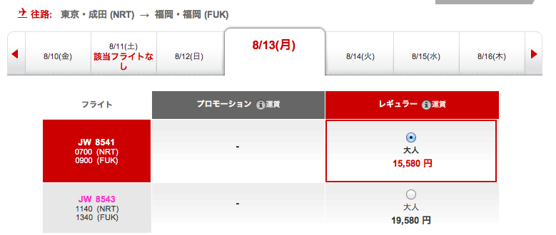 対抗するエアアジアジャパンの成田・福岡線は8月11日は満席、12日~13日は15,580円~19,580円で販売されている。
