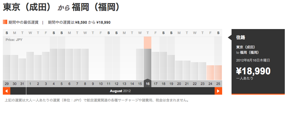 まずは成田空港に新規就航したジェットスターの運賃をみよう。記事執筆時点(7月16日23時現在)、ジェットスターの成田・福岡線は8月9日~14日は満席で、前後の日の運賃(空席連動型)は16,990円~18,990円となっており、比較的高い運賃で推移している。