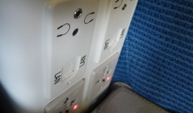 肘掛けの上の部分には、全世界対応型のコンセントとイヤホンジャックがあります。