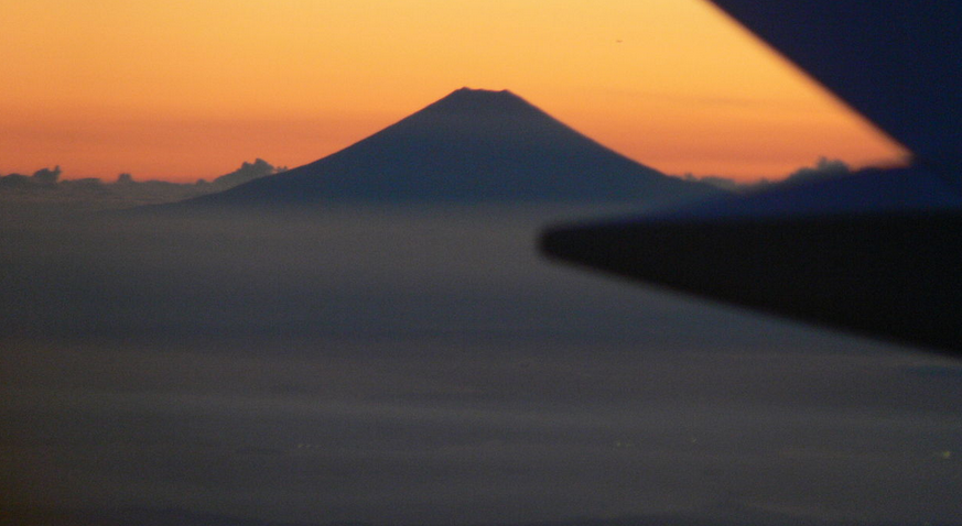途中、機長アナウンスで夕日に染まる富士山が見えるとのことで、窓を見ると夕焼けに染まる富士山が見えた。