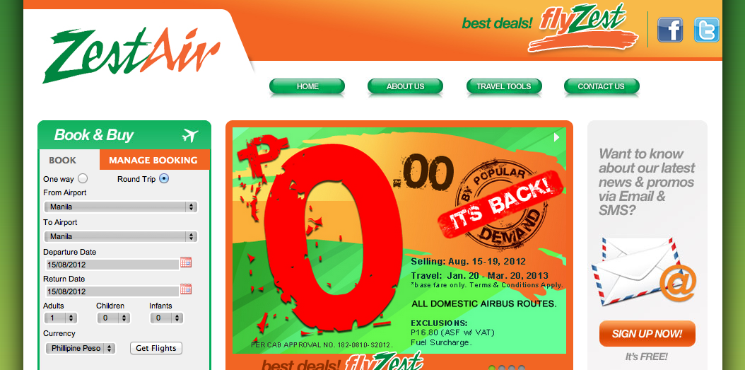 フィリピンのLCC、ZestAirは、2012年8月19日まで、フィリピンの国内線全路線を0ペソで発売する、プロモーションを実施中となる。