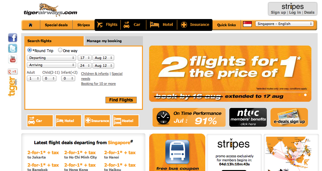 タイガーエアウェイズは、往復のフライトを取ると、片道分の料金+往復分の税で乗れるキャンペーンを、2012年8月17日まで実施している。