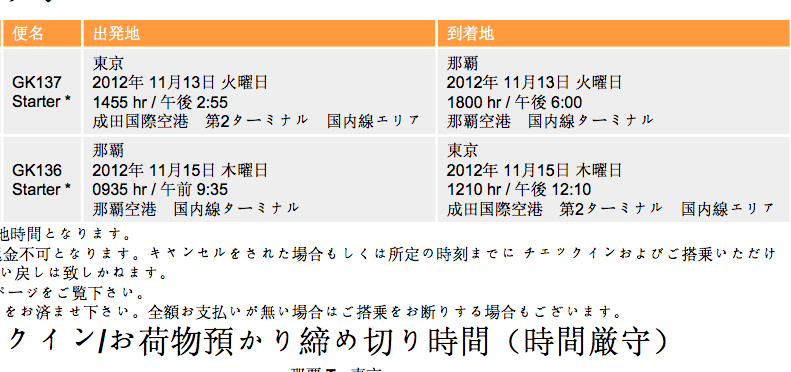 例えば、GK136便・那覇〜成田線の場合、午前9時35分発が、17時30分発に変更になっていました。