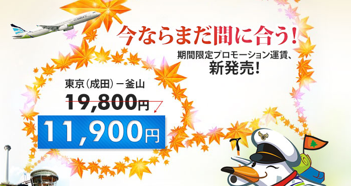 エアプサンは、2012年9月28日までの期間限定で、「SMART 7 SPECIAL」運賃を発売している。通常は往復19,800円のところ、11,900円ですので、かなりお得となる。