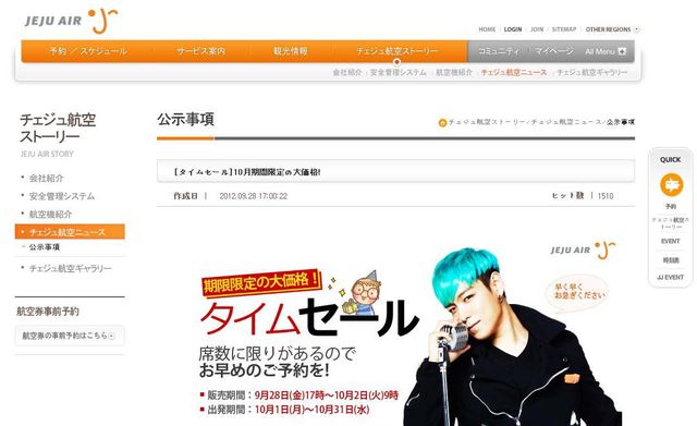 済州航空(チェジュ航空)では、2012年10月2日午前9時までタイムセールを実施している。