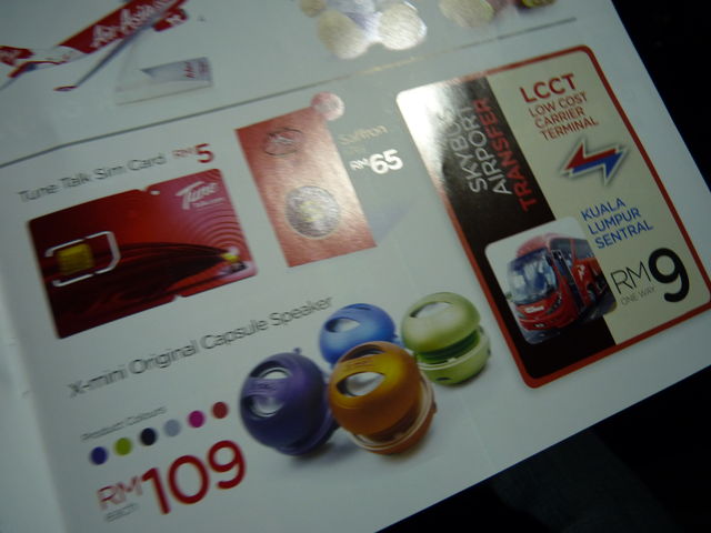 機内販売では、TuneTalkのSIMカード(5MYR、約135円)や、クアラルンプールLCCターミナル~市内までのスカイバスのチケット(9MYR、約240円)の販売も行われている。