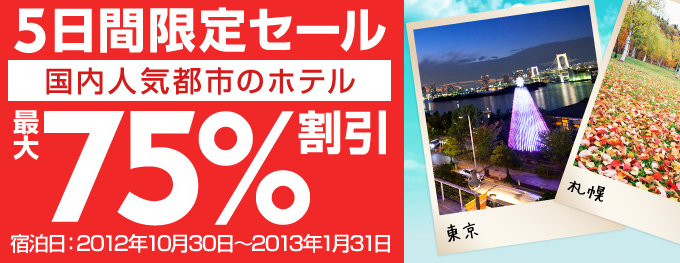 宿泊期間は10月30日から2013年1月31日までで、対象となるのは札幌、東京、京都、大阪、福岡、那覇の各ホテル。セールは一部ホテルを除いて、年末年始やクリスマス期間も対象となる。