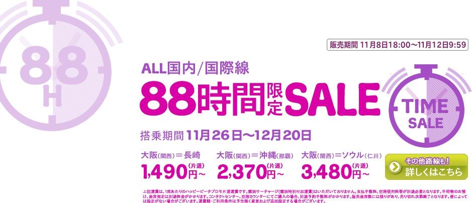 Peachは、2012年11月8日午後6時から、国内・国際線全路線で、「88時間セール」を開催する。