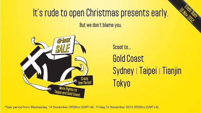 Scoot(スクート)は、48時間限定で、シンガポール発着の各路線でセールを開催している。発売期間は、2012年11月16日午前10時まで。