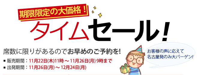 チェジュ航空(済州航空)は、名古屋/中部〜ソウル/仁川・ソウル/金浦線で、2012年11月26日午前9時までの間、タイムセールを開催している。