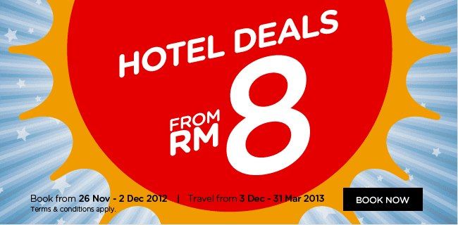 エアアジアグループのホテル予約サイト「AirAsiaGo」は、エアアジアグループ各社が2012年11月26日より開始予定の11周年記念セールに合わせ、ホテルを8マレーシアリンギット(MYR、215円)より発売する。
