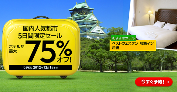 宿泊予約サイトのエクスペディアは、国内人気6都市のホテルを、最大75%割引セールを、12月1日まで開催している。
