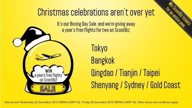 Scootは、2012年12月28日9時59分(日本時間)までの予約で、ビジネスクラス「Scoot Biz」のペアチケットが抽選で当たるキャンペーンを開催している。