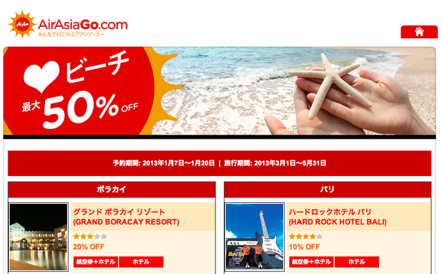 エアアジアグループの宿泊予約サイト、AirAsiaGoは、2013年3月〜5月のホテル+宿泊のダイナミックパッケージと、ホテルの予約で、最大50%オフになるセールを開催している。