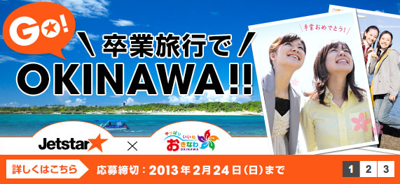 ジェットスターは、東京/成田・大阪/関西発着の沖縄往復航空券を、4名1組にプレゼントする、「Go!卒業旅行でOKINAWA!!」キャンペーンを、2013年2月24日まで開催している。