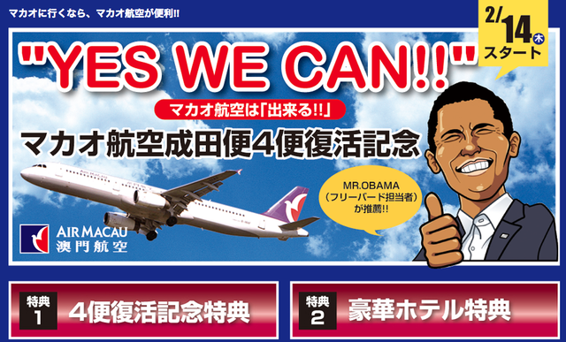 マカオ航空は、2013年2月14日より、東京/成田〜マカオ線が週4便に復便されることを記念したキャンペーンを開催している。