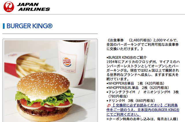JALマイレージバンクは、2,000マイル特典として、バーガーキングのお食事券に交換できるようになりました。
