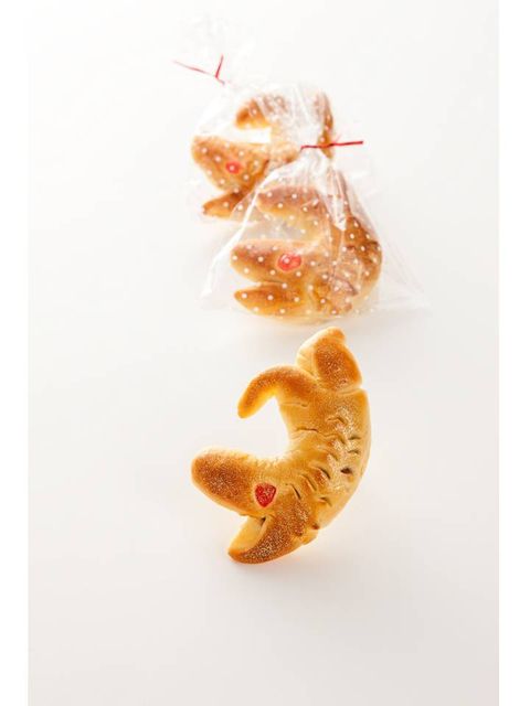 『しゃちほっこりパン』は、名古屋の象徴である金のしゃちほこを象ったパンで、黄金色に焼き上げられたパンの表面に金粉をまとっている。