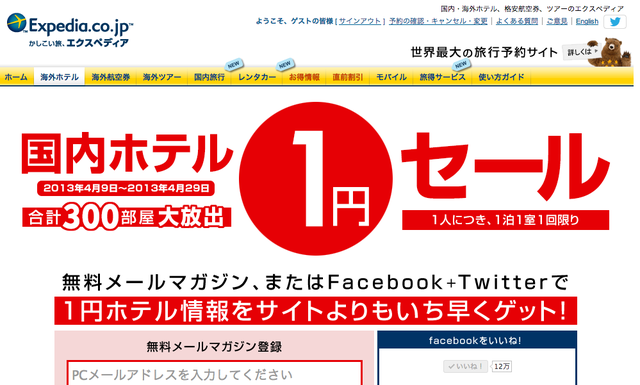 エクスペディアは、2013年4月9日〜29日の間、国内ホテル合計300室を1円で発売する。