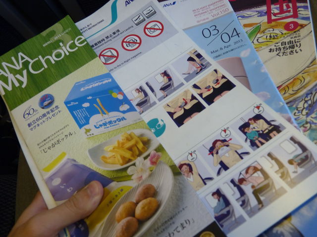 座席ポケットに搭載されているのは、ANAMyChoiceのカタログ、翼の王国、ANASKYSHOPのカタログ、安全のしおり、ゲロ袋の5個。
