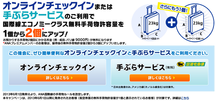 ANAは、国際線のエコノミークラスを対象に、「オンラインチェックイン」か「手ぶらサービス」の利用で、受託手荷物の無料手荷物許容量を1個から2個にアップするキャンペーンを、2013年6月1日〜9月30日まで開催する。