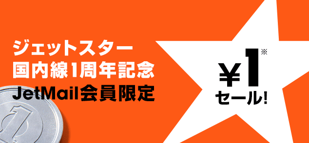 ジェットスターは、2013年7月3日午後2時から、国内線就航1周年を記念し、JetMail会員限定で1円セールを開催する。