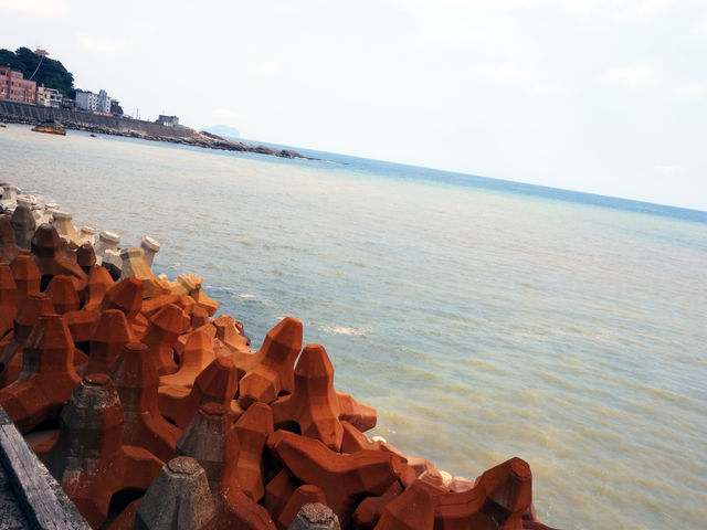 鉱山から流れ出る物質によって、消波ブロックが『黃金瀑布』と同じ色に変色し、海水も赤茶色に変色している。