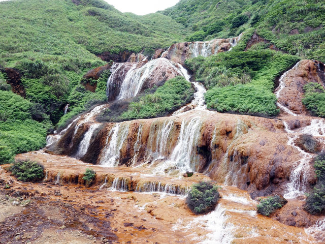 水が流れる岩肌が茶色っぽくなっているのは、その昔、炭鉱として栄えた九份の鉱山から流れ出る物質によるものとのこと。