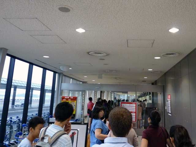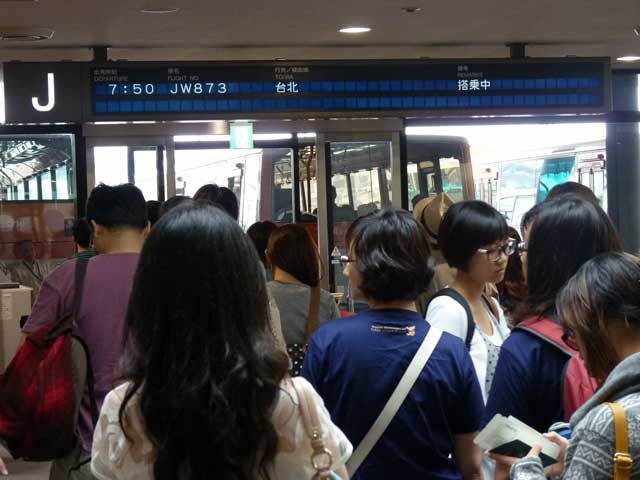 ちょうど、ソウル/仁川行きとチェックイン時刻が重なるため、かなりの混雑に。途中から台北行きの乗客は専用カウンターでのチェックインにしたのですが、カウンターが1つであることや、重量オーバーの乗客などの対応に時間がかかり、結局、筆者は出発の45分前にチェックインを完了。