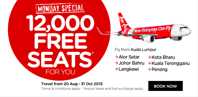エアアジアは、2013年7月29日〜8月4日まで、12,000席限定で無料座席を販売中となる。