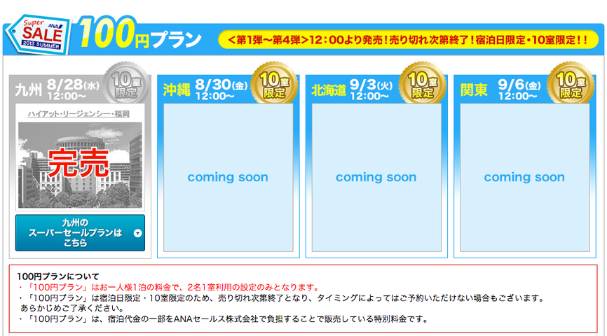 8月28日午後0時より、ハイアット・リージェンシー福岡を10室限定で100円で発売し、すでに完売している。