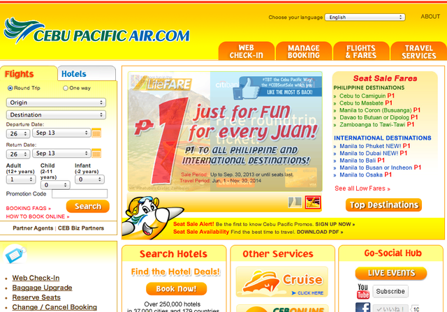 セブパシフィック航空は、フィリピン国内・国際線全路線で、1フィリピンペソ(PHP、約3円)のセールを、2013年9月30日まで開催している。