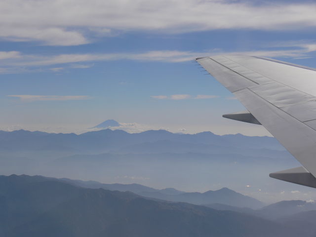 飛行機は、青森市~八郎潟~日本海上空を飛行。しばらく雲の中を飛んでいましたが、気づいたら松本上空まで来ていました。しばらくすると木曽谷上空を飛行し、遠くに富士山も見えました。