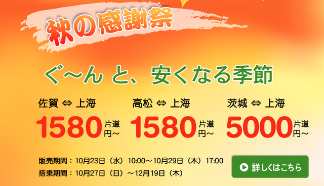 佐賀・高松〜上海/浦東線が片道1,580円から、茨城〜上海/浦東線が5,000円からとなり、諸税と燃油サーチャージ(日本発5,000円、上海発450CNY)は別。