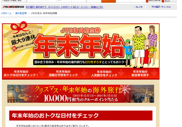 i.JTBは、2013年12月20日〜2014年1月12日の航空券予約実績に基づき、年末年始の予約動向をまとめ、発表した。