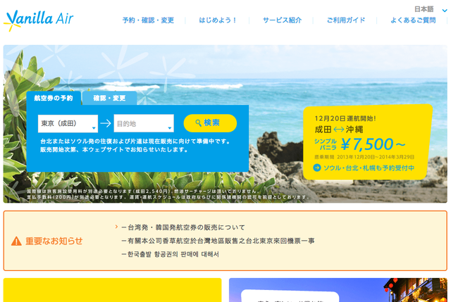 2013年12月20日に就航するLCC、バニラ・エアは、11月25日正午より、東京/成田〜沖縄/那覇線を対象に、セール運賃「わくわくバニラ」を発売する。
