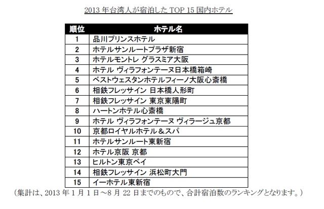 また、Hotels.com台湾サイトの2013年1月1日~6月30日のデータによると、台湾人旅行者で「東京」のホテルを検索する約65%は、3~3.5星ホテルを好み、最も人気のある宿泊地は新宿。2位の「大阪」でも、約70%が3~3.5星ホテルを好み、難波や心斎橋周辺のホテルが人気という結果となった。