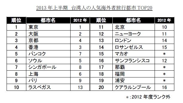 Hotels.comの台湾サイトの利用者による、Hotel Price Index(2013年1月~6月)の結果をみると、海外旅行都市TOP20のうち、東京が1位、大阪2位、京都が3位となり、世界の観光地の中でも日本旅行の需要が非常に高くなっている。また、今回初めて17位に那覇、18位に福岡、19位に浦安がランクインし、日本国内が広く台湾人旅行者に人気があることがわかった。