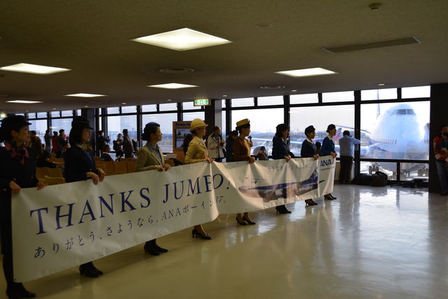機体出口では、多くの地上係員が拍手で出迎えたほか、横断幕を持った、歴代の客室乗務員の制服を着たスタッフも乗客を歓迎。記念撮影を嬉しそうにする乗客の姿も。