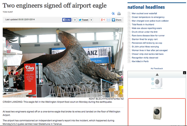 ニュージーランド・ウェリントン国際空港で、2014年1月20日に起きたマグニチュード6.2の地震で、大きなワシの像が落下する騒ぎがあった。